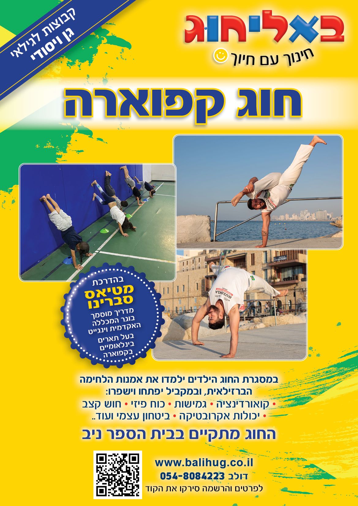 במהלך השנה הילדים ילמדו את אמנות הלחימה הברזילאית, יעבדו על גמישות, חיזוק הגוף, יפתחו את חוש הקצב ויהנו ממגוון פעילויות, תחרויות ומעגלי קפוארה לאורך השנה.